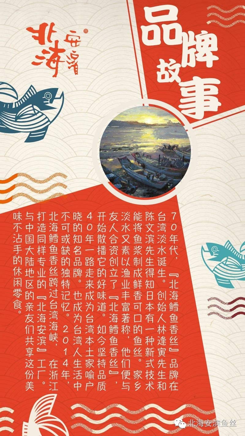 【概要描述】70年代,“北海鳕魚香絲”品牌在台灣淡水誕生。創始人林逢寅先生和陳文濱先生得知日本有一種(zhǒng)新式技術能(néng)將(jiāng)魚漿制成(chéng)鮮香可口的魚絲。家鄉淡水又素以漁業豐富著稱,他們便與友人合資創立了“北海鳕魚香絲”,開(kāi)始散播它的好(hǎo)味道(dào)。如今堅持品質40年一路走來成(chéng)爲台灣本土家喻戶曉的知名品牌。也成(chéng)爲台灣人生活中不可或缺的獨特記憶。2014年,北海鳕魚香絲跨過(guò)台灣海峽,在浙江打造同樣(yàng)專業的“北海安濱”工廠。與中國(guó)大陸地區的親友們共享這(zhè)份美味不沾手的休閑零食。